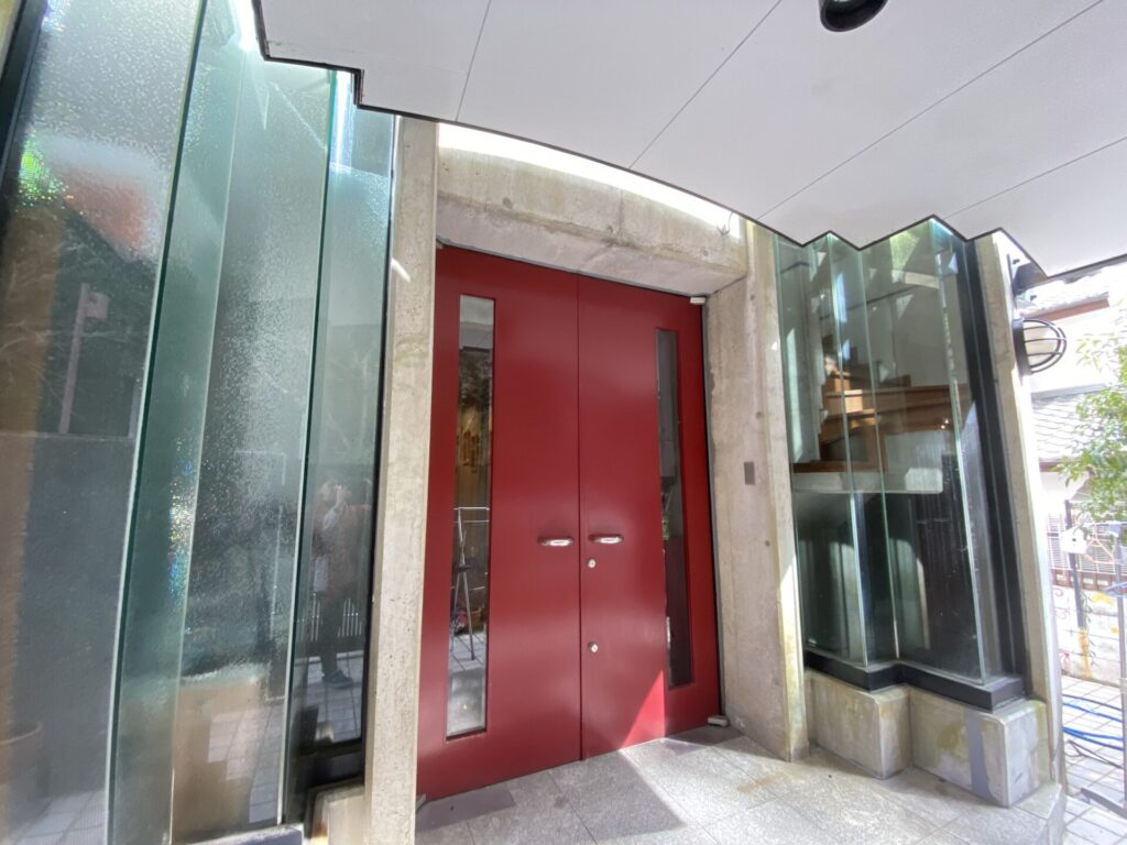 The entrance door is a massive red double swinging door.