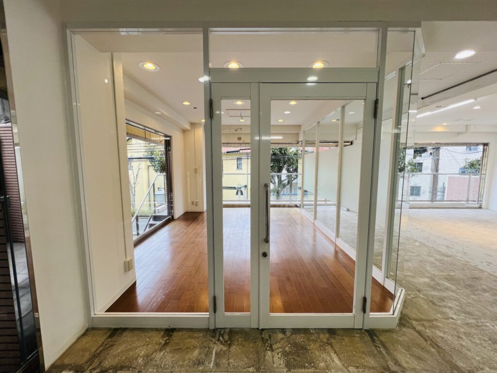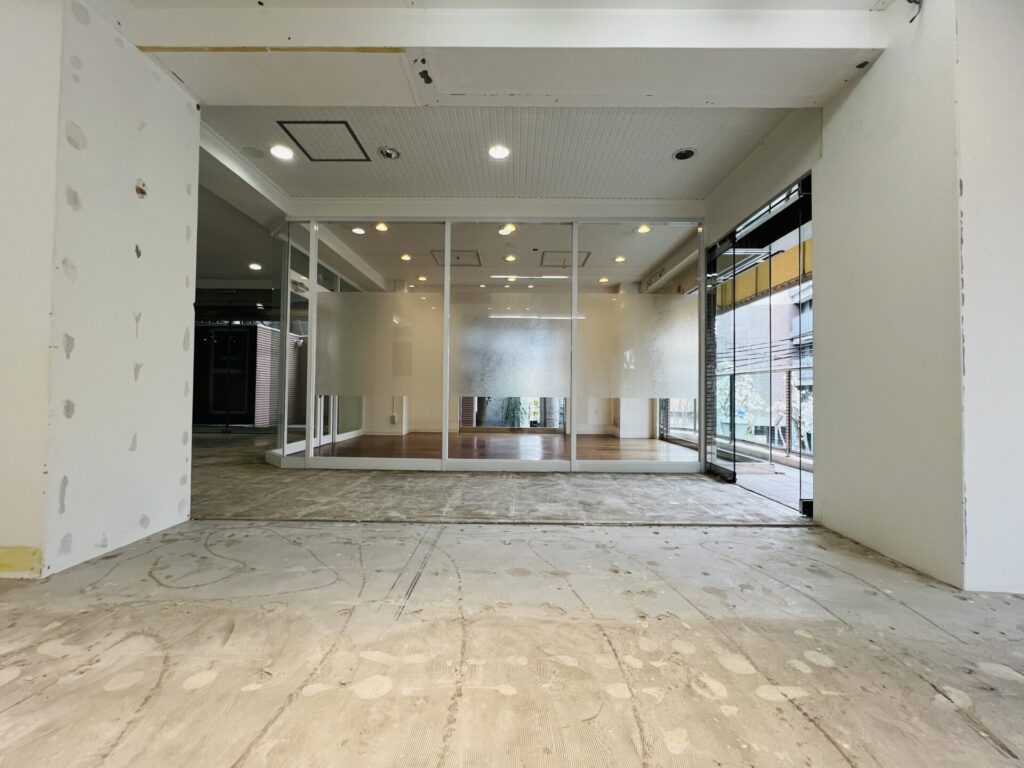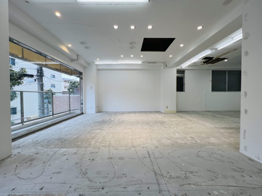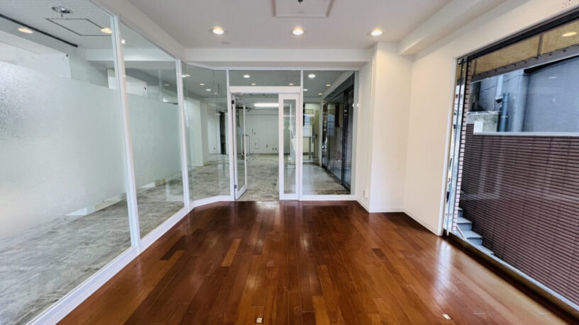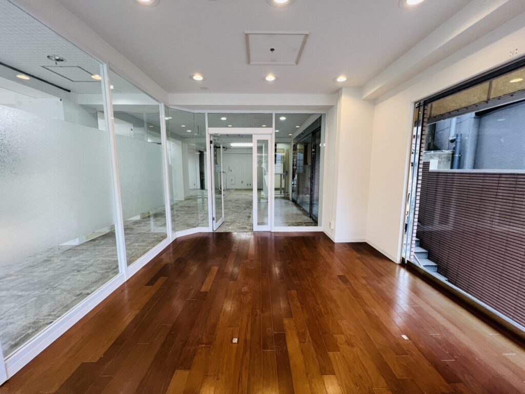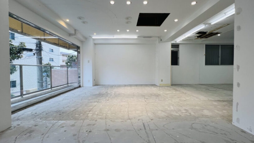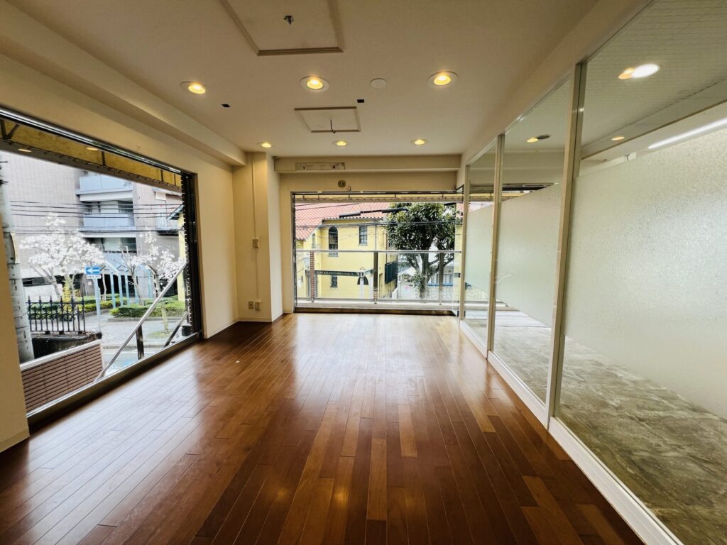 Located along one of the popular streets in Kitano. Spacious 140 sqm commercial space. A part of the space, enclosed with floor-to-ceiling glass partitions (partly translucent) and wood flooring, would be ideal for a showroom or reception room, etc. The rest is an open space and the layout and interior can be designed as you wish at your cost (it is required to restore to the original state when moving out). The L-shaped balcony and windows/doors on south and east sides bring in plenty of light and air.