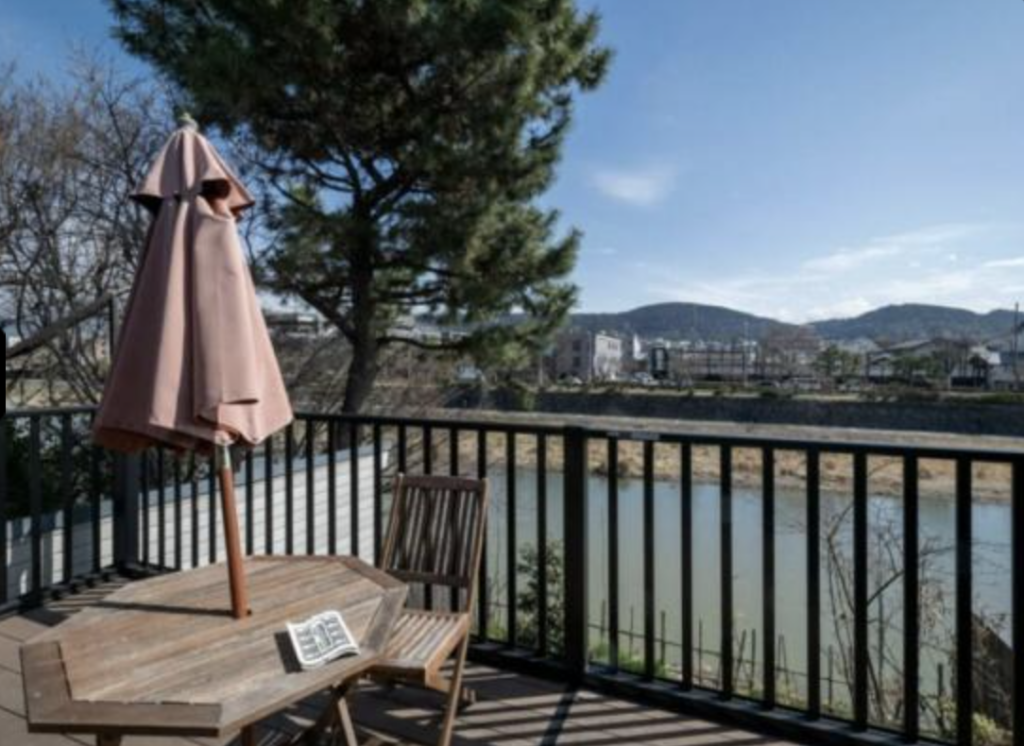Traditional Kyoto-Machiya-style house with a striking view of the river and mountains. Riverfront premium location along Kamo River. With a garden and a courtyard/spot garden.