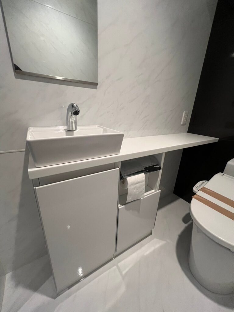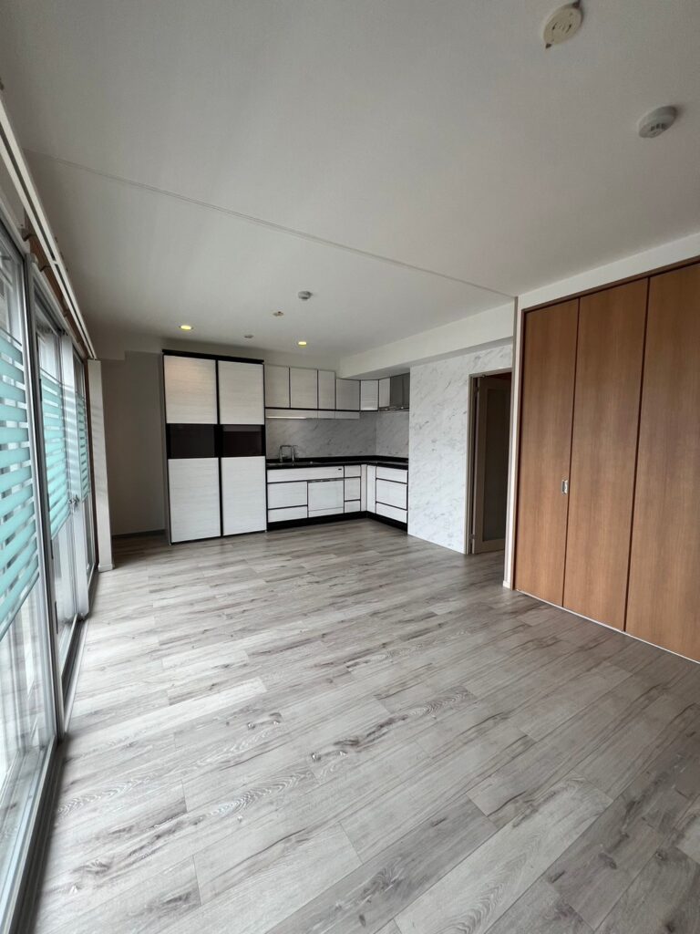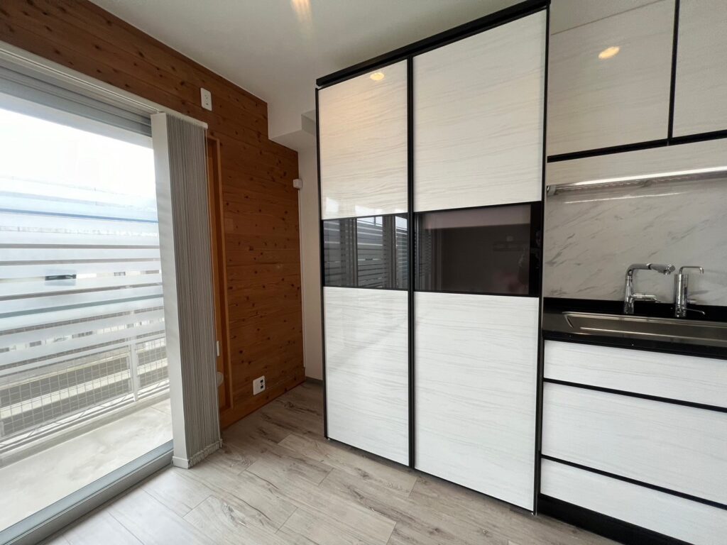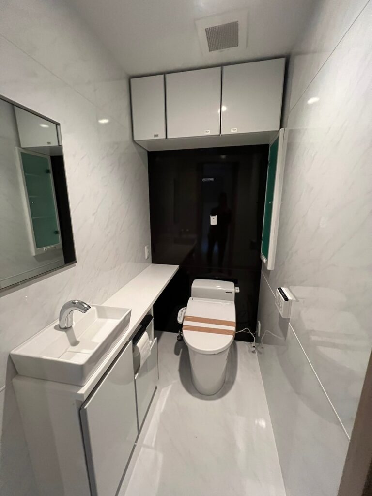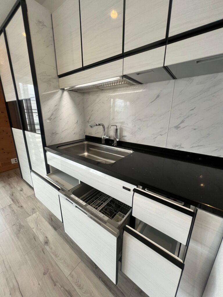 The space was recreated with efficient layout, floor to ceiling high storage, large windows facing south brings plenty of natural light all day. The system kitchen has sleek black granite countertop, IH cooker, plenty of storage space for kitchen equipments and food stock. The countertop and the washbasin height is american size. So you don’t need to duck down when you wash dishes nor face.