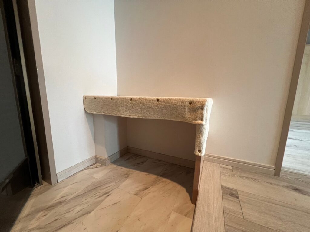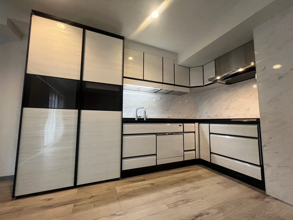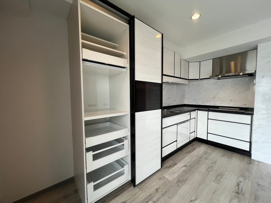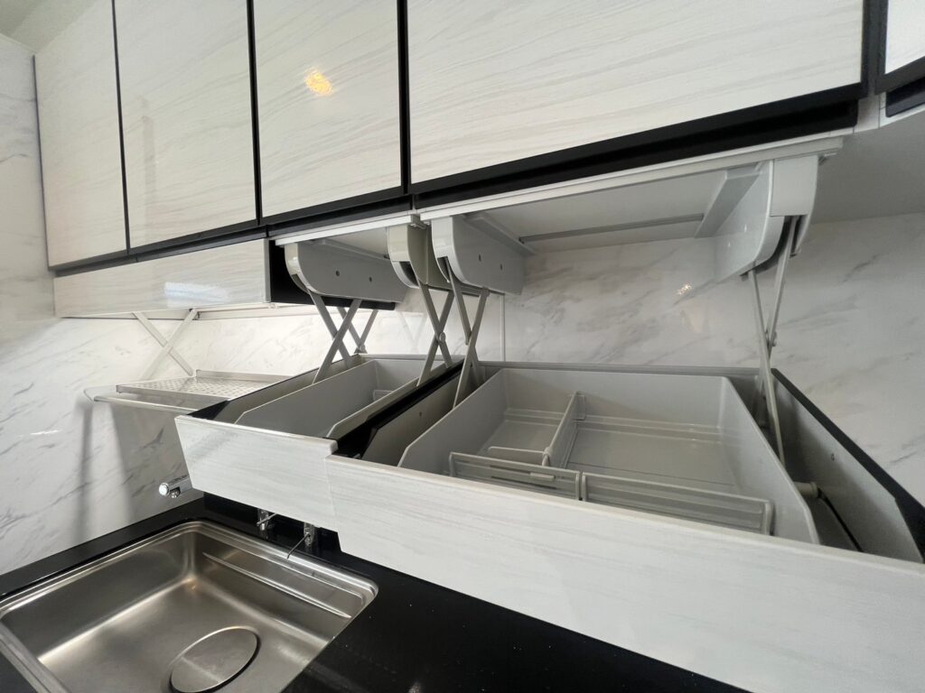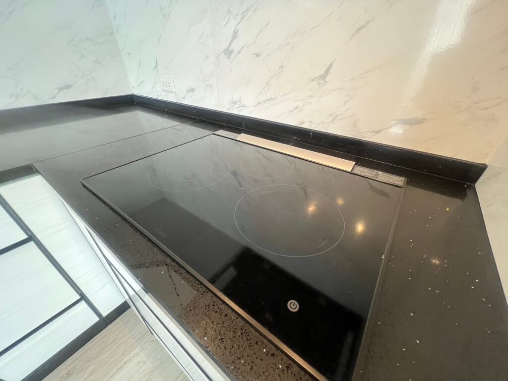 The space was recreated with efficient layout, floor to ceiling high storage, large windows facing south brings plenty of natural light all day. The system kitchen has sleek black granite countertop, IH cooker, plenty of storage space for kitchen equipments and food stock. The countertop and the washbasin height is american size. So you don’t need to duck down when you wash dishes nor face.